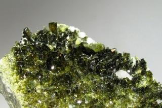 Gemmy green Epidote crystals in association with green Titanite on matrix