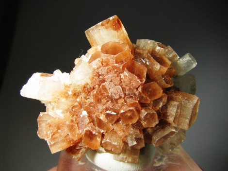 Nice cluster of aragonite crystals to 2 cm long appears to be a complete floater with no visible point of attachment. Classic from this locality the the bright reddish – brown color